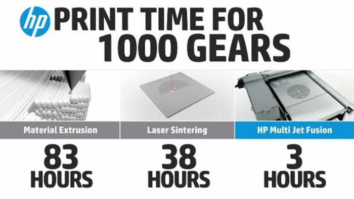 如上麵所述,惠普的這款3D打印機的打印速度將超過當下最快的增材製造設備的10倍。為(wei) 了更加形象和易於(yu) 理解,惠普提供了一組統計數據。以批量生產(chan) 1000個(ge) 齒輪為(wei) 例,使用高品質的激光燒結設備,這些齒輪至少需要38小時才能製造出來。而使用他們(men) 的新多噴頭熔融技術,隻需3個(ge) 小時即可完成。