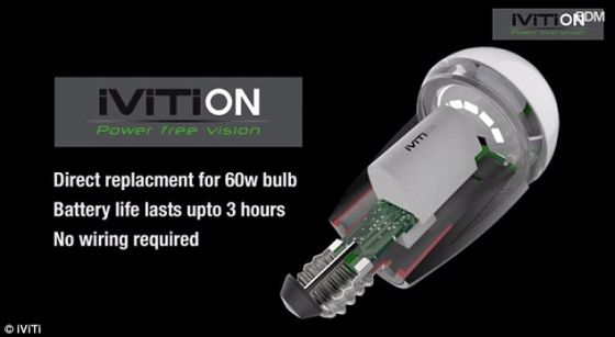 iViTi On可區分停電和有人關(guan) 掉電源開關(guan) ,所以人們(men) 可根據需要將iViTi On關(guan) 掉。它可安裝到一個(ge) 普通燈泡內(nei) ,而且無需附件任何線路。它的發光亮度相當於(yu) 一個(ge) 普通的60瓦燈泡,但它僅(jin) 需8瓦電力。照片展示了內(nei) 部電池的剖麵圖。