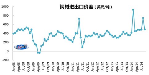 另一方麵,9月份我國進口鋼材平均價(jia) 格1228美元,較去年同期上漲11美元,單月鋼材進、出口價(jia) 差高達489美元(除2014年2月、8月以外最高)。從(cong) 累計情況看,今年前三季度,我國進口鋼材累計平均價(jia) 格1246美元,鋼材進、出口價(jia) 格為(wei) 463.5美元,價(jia) 差連續9個(ge) 月呈擴大趨勢。