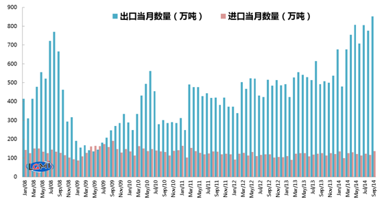 今年以來,我國鋼材出口保持良好態勢,從(cong) 數量上來講,出口量的大幅增長對國內(nei) 資源的緩解起到明顯作用,而出口訂單也保證了鋼廠的回款速度,在一定程度上來說,鋼廠前三季度的利潤大幅回升與(yu) 良好的出口態勢密不可分。但對此也不可盲目樂(le) 觀,量增價(jia) 跌的局麵無法扭轉。目前我國鋼鐵工業(ye) 麵臨(lin) 著規模大、產(chan) 量高、利潤低、國際競爭(zheng) 力弱的局麵。中國鋼材產(chan) 品僅(jin) 依靠低價(jia) 走出國門的做法不具備長久戰鬥力,單就傳(chuan) 聞中的取消出口退稅一旦落地,中國鋼材出口優(you) 勢就將大打折扣。另蘭(lan) 格鋼鐵信息研究中心跟蹤統計數據顯示,2013年國際上涉及到中國鋼鐵行業(ye) 的貿易摩擦有25起,而截至到2014年9月底,已達20餘(yu) 起,中國大量的低附加值鋼材產(chan) 品以低價(jia) 爭(zheng) 奪國際市場使得貿易摩擦逐漸升級。