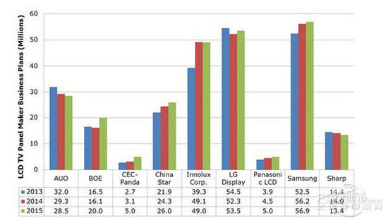 2013-2015年LCD TV麵板廠商出貨計劃(單位:百萬(wan) 片)(來源:DisplaySearch)