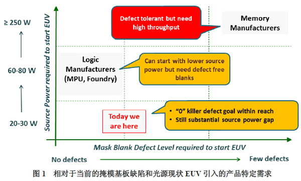 當考慮引入EUVL技術的情況下,我們(men) 需要考慮產(chan) 品的具體(ti) 要求來了解目前關(guan) 鍵參數的狀態,如電源功率和掩模基板缺陷。下圖突出了行業(ye) 的當前狀況,並顯示了開始使用EUVL的光源功率和掩模基板缺陷水平。圖1是一個(ge) 簡化示意圖,但它表達了一個(ge) 重要信息,邏輯製造商以及他們(men) 的代工企業(ye) 是最有可能率先啟動EUVL的。在邏輯製造商之間,代工企業(ye) 在他們(men) 目前的商業(ye) 模式擴展多個(ge) 圖案是很困難的,因為(wei) 他們(men) 必須遷就所有客戶的設計空間,而一個(ge) 獨立的設備製造商可以控製設計、技術和製造一係列過程,比代工廠可以進一步推動特定技術。