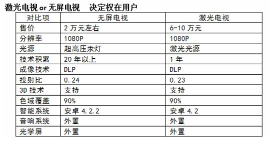 對於(yu) 用戶來講,無論是無屏電視還是激光電視,關(guan) 注的核心在於(yu) 效果、價(jia) 格和售後。無屏電視、激光電視對消費者的大畫麵、高清晰、護眼、智能等功能需求基本一致;但價(jia) 格相差巨大,影響產(chan) 品進入普通大眾(zhong) 家庭;無屏電視采用超高壓汞燈光源,用戶獨享終身免費換燈的優(you) 惠,而激光電視宣傳(chuan) 支持25000小時,對於(yu) 新技術的進入或許很難打動獵奇的用戶。