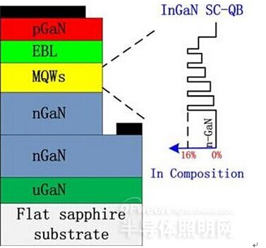 研究人員所設計的LED結構如圖1所示,該結構中多量子阱(MQWs)有源區的量子壘(QBs)使用InGaN材料代替傳(chuan) 統藍光LED中使用較多的GaN材料,並且InGaN量子壘中的In摩爾組分是變化的,從(cong) P型層到N型層的方向階梯式降低(InGaN-SC QB),即量子壘層的勢壘從(cong) P型層到N型層的方向階梯式降低。所設計的有源區結構能降低空穴在有源區擴散的勢壘,從(cong) 而使空穴在多量子阱中分布更均勻。而他們(men) 原來的研究發現(Appl. Phys. Lett. 93,021102 (2008),傳(chuan) 統GaN量子壘(GaN QB)LED中大部分空穴分布在靠近P型層的1-2個(ge) 量子阱中,造成在大電流密度注入下量子阱中載流子密度很高,從(cong) 而導致LED效率下降。
