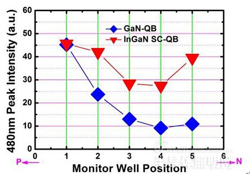 該團隊還對新型InGaN-SC-QB LED低效率下降的物理機製做了實驗研究。所采用的方法被稱之為(wei) 檢測阱方法(monitor well method),即將藍光多量子中的一個(ge) 阱替換為(wei) 發光波長為(wei) 480nm的長波長量子阱,用以估計該阱中的載流子密度與(yu) 所處位置的關(guan) 係。如圖3給出了在200A/cm2電注入下,InGaN-SC-QB LED與(yu) 傳(chuan) 統GaN-QB LED中檢測阱的發光強度。該結果顯示在傳(chuan) 統GaN-QB LED中量子阱的發光強度從(cong) 靠近P型的量子阱到靠近N型的量子阱近似指數下降,最靠近P型的量子阱的發光強度是最靠近N型的量子阱的發光強度的4.5倍,這也說明空穴的高度不均勻分布。而在InGaN-SC-QB LED中,發光強度的最大差別隻有1.7倍,即第4個(ge) 阱和第一個(ge) 阱的差別。這個(ge) 結果強有力地證實了空穴分布的改善,也揭示了InGaN-SC-QB LED中量子效率基本不下降的物理機製。