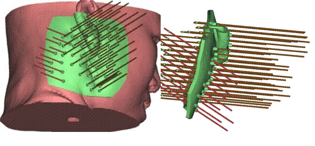 首先,要根據腫瘤的形狀、大小來設計、計算需要植入多少顆放射粒子,才能把癌細胞完全殺死。因此,第一步要獲得腫瘤的形狀和大小等信息。獲得腫瘤形狀的方法現在有很多種,像CT掃描、核磁共振等,用這些方法獲得腫瘤斷層的數據後,對斷層掃描數據進行三維重構。在計算機中,根據腫瘤的三維模型,可以計算出所需要的粒子數量並規劃出粒子的排布(如圖4所示)。第二步是把粒子植入到腫瘤體(ti) 內(nei) 。現在通常的方法是微創穿刺手術,即把粒子放置在針頭,用一根針刺入腫瘤內(nei) ,根據設計好的方向和部位下針,待到粒子達到設定的位置後,把粒子放下,再植下一個(ge) 粒子。這樣一一將事先設計好的粒子放置在所設計的位置。整個(ge) 過程可以先在電腦裏麵設計模擬出來,用多少根針,從(cong) 什麽(me) 方向,把粒子一一地放進去,見圖5。第三步,就要用到3D打印了。#p#分頁標題#e#