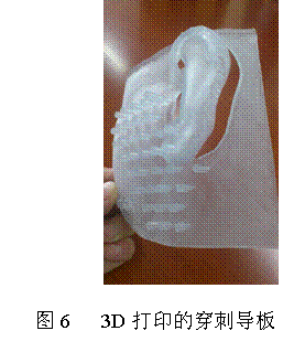 根據病人不同的病灶,可以設計不同的導板,用3D打印出來,如圖6。 手術時,醫生隻要沿著導板的針孔形狀把針一個(ge) 一個(ge) 地插進去,就能順利、很簡單地將粒子植入到腫瘤體(ti) 內(nei) 。放射粒子植入進入以後,可以通過CT觀察植入的情況。