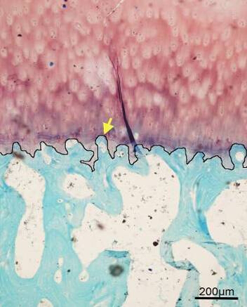 圖1關(guan) 節上軟骨/骨聯合縱切的組織學染色切片(a)及軟骨下骨掃描電鏡圖(b)