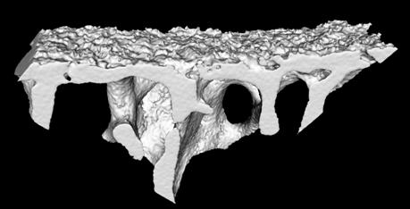 利用連續組織學染色切片和實驗室開發的關(guan) 節骨軟骨界麵無創剝離技術獲得的軟骨與(yu) 骨界麵分離的電鏡數據(圖1),結合計算機醫學掃描圖像數據(MicroCT)和反求工程技術,構建起關(guan) 節軟骨與(yu) 骨界麵顯微三維結構模型,定量化給出關(guan) 節軟骨、骨及其界麵多層次典型結構特征、統計學規律與(yu) 參數化模型。研究發現關(guan) 節上軟骨與(yu) 骨的聯接是通過包括軟骨、軟骨下骨板以及關(guan) 節麵附近的鬆質骨等多個(ge) 層次複合結構。特別是軟骨層和軟骨下骨板層的上表麵分布著很多圓孔結構,孔徑平均值分別為(wei) 17.04μm,34.08μm,且其孔隙主要以三邊形、四邊形等方式排布。通過多孔板狀結構軟骨下骨(圖2),軟骨以鉚合、嵌鎖、管道連接、分子連接等方式連接於(yu) 骨麵。因此,我們(men) 提出軟骨層和軟骨下骨板層上的孔結構可能是營養(yang) 供給的通道的假設。而目前臨(lin) 床上對關(guan) 節軟骨的修複治療一直都未取得突破性的進展,尤其對關(guan) 節軟骨修複後的退變缺乏有效的手段,這可能是由於(yu) 對軟骨下骨在軟骨修複中的重要作用未予以足夠重視,忽視了在非正常力學狀態下修複關(guan) 節軟骨表型難以保持長期的穩定性,進而影響了關(guan) 節軟骨的長期修複效果。