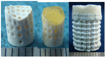 實驗室以生物陶瓷和水凝膠光固化3D打印成型技術(圖3)為(wei) 基礎,模仿關(guan) 節軟骨與(yu) 骨的層次結構,以結構嵌入的方法將軟、硬不同的兩(liang) 種材料複合成型製造骨軟骨支架。即首先以光固化3D打印成型具有多層次圓形孔隙的陶瓷骨體(ti) 支架,然後以骨體(ti) 支架為(wei) 基底,在陶瓷支架表麵以凍幹成型或光固化3D打印成型水凝膠軟骨層後獲得軟骨/骨關(guan) 節體(ti) (圖4)。