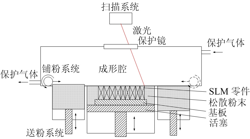 在高激光能量密度作用下金屬粉末完全熔化、經散熱冷卻實現與(yu) 固體(ti) 金屬冶金焊合成形。SLM技術正是通過對激光選區內(nei) 的金屬粉末完全熔化、經散熱冷卻固化、層層累積成形出三維實體(ti) 的3D打印技術。SLM金屬粉末成形技術的原理如圖1所示。