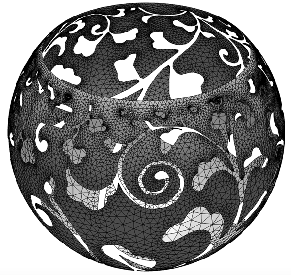Cole首先使用穀歌搜索找到合適的燈影圖案設計,然後計算出如何對其進行球麵投射。然後他使用Matlab軟件(一種數學仿真軟件)將其計算結果轉化為(wei) 3D打印模板——從(cong) 位圖圖像轉換為(wei) 矢量格式。接下來Cole用Mesh2D軟件設計出網格,然後又回到Matlab軟件將整個(ge) 設計彎成球麵。