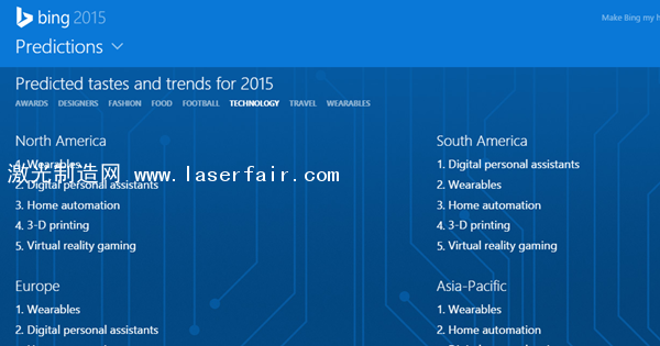 而針對科技發展趨勢部分,Bing Search分別預測智能穿戴、數字個(ge) 人助理、家居自動化、3D打印、虛擬現實遊戲都將成為(wei) 2015年熱門趨勢,其中在智能穿戴裝置部分,則將以Apple Watch最受到關(guan) 注,其次包含三星Gear、FitBit、Jawbone與(yu) 微軟智能手環都將成為(wei) 矚目焦點。