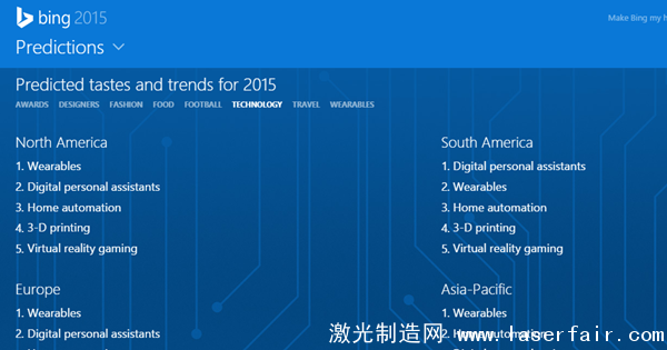 而針對科技發展趨勢部分,Bing Search分別預測智能穿戴、數字個(ge) 人助理、家居自動化、3D打印、虛擬現實遊戲都將成為(wei) 2015年熱門趨勢,其中在智能穿戴裝置部分,則將以Apple Watch最受到關(guan) 注,其次包含三星Gear、FitBit、Jawbone與(yu) 微軟智能手環都將成為(wei) 矚目焦點。
