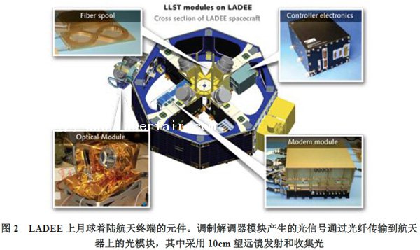 LLCD發射器是基於(yu) 商業(ye) 通信部件,包括分布反饋二極管激光器、摻鉺光纖放大器和調製器,避免空間定製激光器的高成本,美國宇航局光通信事業(ye) 部總監Donald Cornwell說。設計、建造和運行由麻省理工學院的林肯實驗室完成,發射器通過10cm望遠鏡發射0.5W 1550nm波段激光,一個(ge) 16進製脈衝(chong) 位置調製編碼四位數據脈衝(chong) ,在月球軌道的月球大氣與(yu) 粉塵環境探測器(LADEE)(見圖2)運行速率622Mbit/s。為(wei) 了最大限度提高靈敏度,地麵接收器采用工作在1-3K的超導納米線陣列探測器。單個(ge) 1550nm光子可以加熱4nm線足夠阻止超導,Cornwell說“這一靈敏度是很驚人的,檢測效率達到70%~80%”。