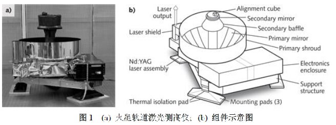 圖1所示為(wei) 全新火星軌道激光測高儀(yi) ,是專(zhuan) 門為(wei) 較小的後續火星探測任務 1996年發射的火星全球勘探者號製造的。這個(ge) 任務獲得了巨大成功,從(cong) 1998年3月到2001年6月,激光高度儀(yi) 測量火星從(cong) 南極到北極的海拔,形成了太陽係行星中最精確的全球地形圖。二極管泵浦、Q開關(guan) 、Nd:YAG激光器每秒鍾發射十個(ge) 48mJ脈衝(chong) ,每束脈衝(chong) 持續8ns。總共算下來,它發射了6.7億(yi) 束脈衝(chong) ,這一數據引自一份表述火星有冰川的最新報告。