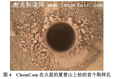 自2012年8月以來,好奇號火星車已經探測到火星土壤和岩石,通過一個(ge) 稱為(wei) ChemCam 的儀(yi) 器將30mJ激光脈衝(chong) 持續5ns聚焦到一個(ge) 亞(ya) 毫米點上(見圖3)。它使用一個(ge) 鉀鎢酸釓[Nd:KGd(WO4)2或Nd:KGW]摻釹棒,因為(wei) 其廣泛的溫度範圍。激光脈衝(chong) 燒蝕材料表麵並進行激光誘導擊穿光譜(LIBS)上的斑點高達7m的距離。
