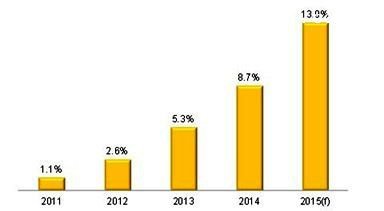 2011~2015年全球LED燈泡市場滲透率變化暨預測(來源:DIGITIMES,2014/12)