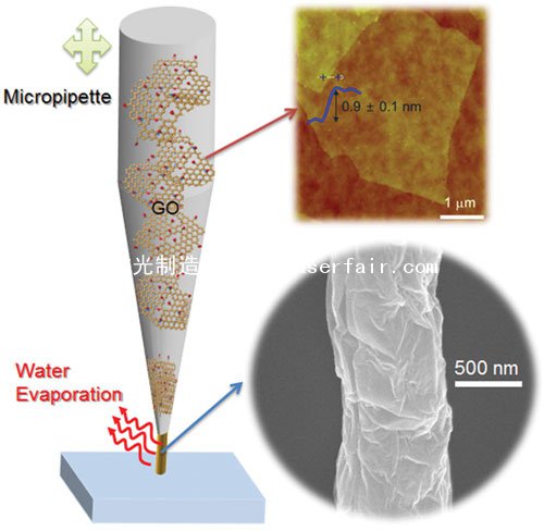 在論文中,Seol教授的研究小組利用彎液麵作為(wei) 一種全新的方法來實現納米級的3D打印。首先,科學家在室溫下使用微量吸管在其前端形成彎液麵,隨後在上麵生長出石墨烯氧化物(GO)線。該導線然後通過熱或化學處理(用肼)削減。隨著熔劑迅速蒸發,微量吸管拉動石墨烯氧化物(GO)沉積,從(cong) 而實現GO線的生長。
