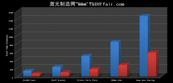 Volcano,意為(wei) 火山,恰如其分地暗示了其以令人印象深刻的速度和體(ti) 積噴湧出熔融塑料的能力。具體(ti) 來說,它在兩(liang) 個(ge) 方麵做了功能增強。首先,它增加了熱端的容積以處理的更多的塑料。另外,它增加了打印對象的層高。這兩(liang) 個(ge) 因素共同作用導致3D打印機的打印速度提升了250%。例如,一個(ge) 典型的大型齒輪軸承——使用標準的E3D-V6熱端大約需要1400分鍾的打印時間——使用新的Volcano升級套件僅(jin) 需600分鍾。