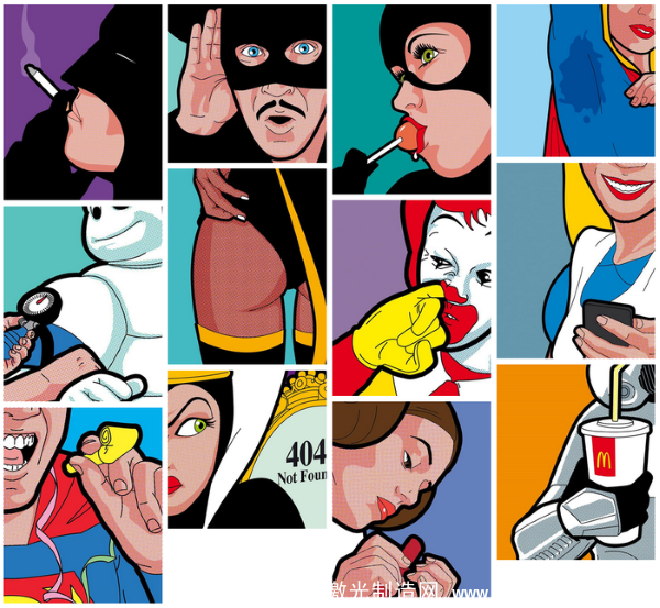 所以您可能會(hui) 在他的作品裏看到各種有趣的場景:神奇女俠(xia) 在填充她的胸罩並努力把胸部擠出溝來;蜘蛛俠(xia) 在大口咀嚼一個(ge) 漢堡;蝙蝠俠(xia) 正在與(yu) 羅賓基情無限;麥當勞叔叔在摳鼻屎等等。Léon重新解構了這些大眾(zhong) 偶像,使其更加人性化和更加真實。
