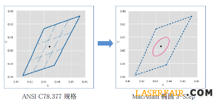 ・對應ANSI C78.377 規格※4 的大約1/9 的「MacAdam 橢圓3-Step」色度管理基準,幾乎感覺不到LED 的色度偏差(Ra 70 min. 型除外)。