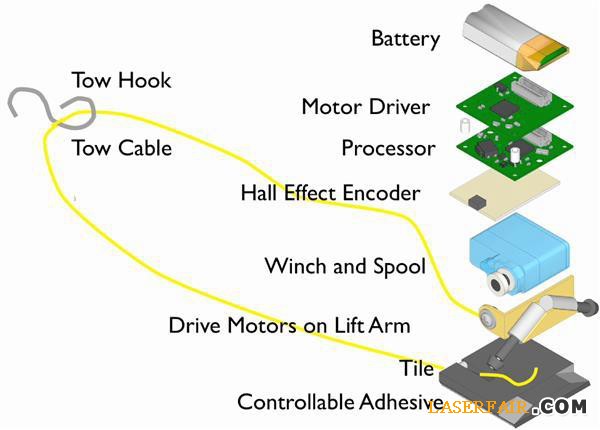 與(yu) 壁虎一樣,機器人MicroTugs的底部覆蓋著數以千計微小的、毛發狀橡膠“鞋釘”,這些小“鞋釘”能夠彎曲並粘附在任何表麵上,形成超強粘力。一旦被鎖定到地麵上,MicroTugs就是有自帶的馬達拖著它的負載(通過纜線和吊鉤)向前行。或許您會(hui) 問了,粘得那麽(me) 結實機器人怎麽(me) 邁腿啊?其實,隻要一個(ge) 指令,這些彎曲的“鞋釘”就可變直,機器人相應的腳就可以輕鬆離開地麵了。