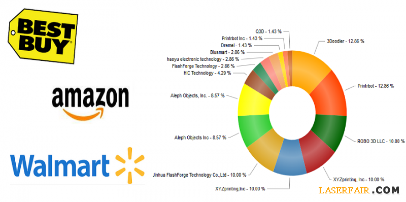 下麵的圖表顯示XYZprinting的產(chan) 品占據了在百思買(mai) 網站3D打印機銷售的近三分之一(33%)。 這可能是由於(yu) XYZprinting的產(chan) 品價(jia) 格實惠所致,緊跟其後的是3D Systems,該公司的產(chan) 品剛剛入駐100家百思買(mai) 在美國的實體(ti) 店,第三位是MakerBot。