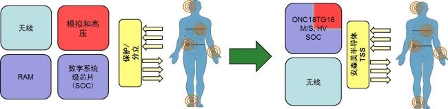 以植入式神經刺激平台為例,安森美半導體提供集成控製器、存儲器、數字、模擬和高壓的單芯片方案,使用多通道浪湧抑製器(TSS)進一步顯著減少分立元件數(通常將IC裸片數從3-4顆減少至1-2顆),有助於減小電路板所占空間,簡化設備製造和物流,降低成本和功耗,減少對係統/電路板的依賴,提升品質,加快產品上市時間,降低開發風險。