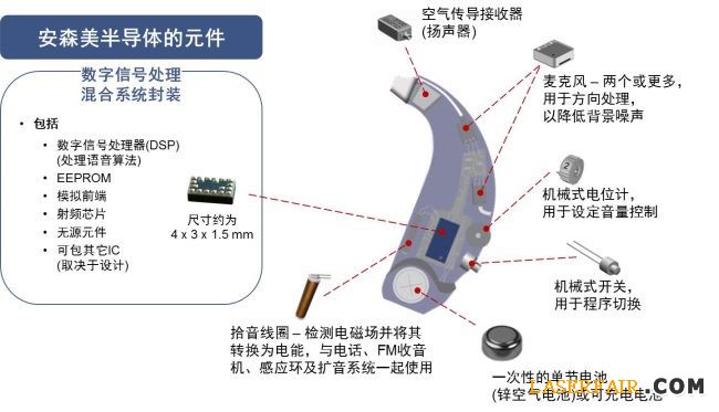 圖3:展示一個典型的助聽器的組成及安森美半導體可提供的元件
