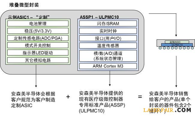 Struix是安森美半導體推出的半定製組合方案,由定製的和標準的ASSP元件組成,即根據客戶的專有規格而定製的一個模擬傳感器接口或一個驅動器,和一個采用ARM Cortex-M3內核 (ULPMC10)的超低功耗唯數字微控製器芯片。“Struix”是“stacked”t疊在一起)的拉丁語形式,它將定製的芯片和標準芯片疊在一個封裝中以提供微型的、高能效的半導體方案,提供比標準元件更多的定製,比完整的係統級芯片(SoC)方案縮短設計時間並降低開發風險及相關成本,適用於血糖監測、透皮給藥、便攜式及定點護理(PoC)病人監控等微型醫療設備。圖5是基於Struix的產品示例,這堆疊微型封裝充分利用矽集成及模塊化,集成度高,易於設計,還進一步增強了設計靈活性,因為ULPMC10微控製器可采用安森美半導體未來的微控製器輕易升級,無須替換模擬前端。