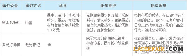 對於產品的追溯可以有效的管控從生產到出貨到銷售再到消費者各個環節,大幅提高公司管控的能力,減少了運營成本。對比發現,在產品品質提高的前提下,采用激光標識係統從長期來看,減少設備維護、人工成本、耗材成本,而且減少了停線檢修的頻次,間接增加了產量。