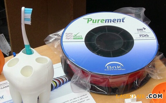 除此之外,展會(hui) 現場還出現了一款值得一提的新型線材Purement,這是世界上第一款具有抗菌能力的3D打印材料。由於(yu) 3D打印技術一般是層積式構建,因此打印出來的對象往往會(hui) 成為(wei) 許多細菌,包括大腸杆菌和沙門氏菌,的溫床。但Purement是經過認證的環保型的抗菌材料,它會(hui) 使得3D打印出來到東(dong) 西對於(yu) 細菌來說不那麽(me) 具有吸引力。因此,它非常適合於(yu) 3D打印玩具、廚房用品以及醫療用品等。