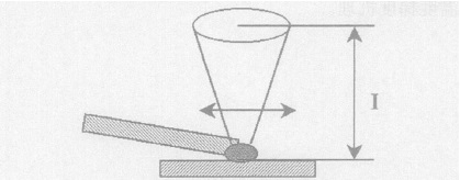 在車頂的機器人編程及焊接實踐中,關(guan) 鍵在與(yu) 確定焦點的大小和相對位置。如圖4所示,錐形體(ti) 代表入射激光,斑點代表落在焊縫表麵的激光焦點,兩(liang) 個(ge) 搭接的陰影塊分別代表待焊的車頂和側(ce) 圍零件。調整聚焦鏡組與(yu) 焊縫上下的距離L就可以改變焦點的大小,調整左右的距離便可確定焦點相對於(yu) 車頂和側(ce) 框的位置。