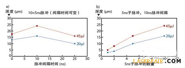 圖(b)是改變子脈衝的數量帶來的不同材料去除率。每一串子脈衝的總能量固定為20或45μJ。