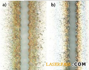 圖(b)是使用了雙脈衝模式(170μJ/脈衝)的上表麵視圖。這兩種情況中的劃刻深度都是4μm。