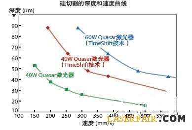 我們使用Quasar激光器對厚度小於100μm的拋光單晶矽片進行熱損傷最小的高速刻劃。在圖1中,曲線顯示,隨著劃刻速度的增加,劃刻深度會降低(200kHz、25ns單脈衝)。在較高的重複頻率下使用較高的功率,同時TimeShift技術可以用軟件設置範圍廣泛的脈衝能量和脈衝寬度,最終我們可以看到,刻劃速度提高了差不多3倍(25ns單脈衝,50μm的刻劃深度)。