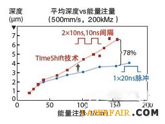 圖3:氧化鋁的刻劃深度vs能量注量曲線,顯示了TimeShift技術對生產率的影響。