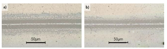圖2顯示了刻劃產生的碎片和熱影響區,它是在單脈衝和能量相同的情況下使用TimeShift技術來創造一個脈衝串(500mm/s和200kHz)。使用這種技術的劃刻可以實現較高的燒蝕質量,並且在上表麵會產生較少的碎片,不過劃刻的深度要比使用單脈衝的深度高出25%。