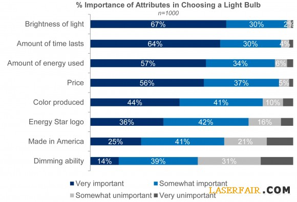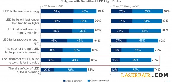 但價(jia) 格並非消費者最關(guan) 注的因素。大多數消費者更看重亮度和壽命,而在這些方麵,LED燈遠勝於(yu) CFL。那些尚未購買(mai) 過LED燈的民眾(zhong) 似乎對LED技術的品質和特點存在誤解。
