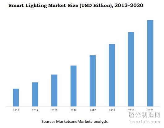 全球照明市場的主要“球員”包括Philips(荷蘭(lan) )、歐司朗(德國)、Acuity Brands Lighting(美國),通用電氣(美國)等。報告中也表示,智能照明市場主要的限製是關(guan) 於(yu) 安裝成本和投資回收期缺乏認識。下圖顯示了智能照明市場2013年至2020年的預計增長。