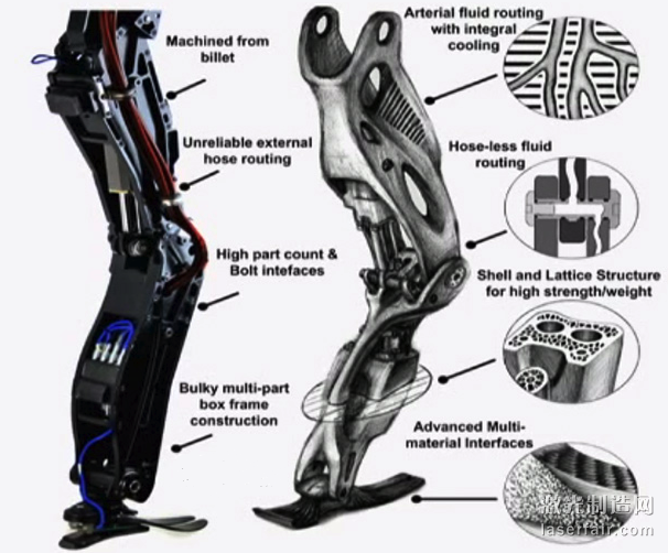 從(cong) 上麵的圖中您可以看到Atlas正在測試中的3D打印腿,與(yu) 當下的機械腿的比較。使用3D打印技術使得研發團隊能夠將液壓係統像血管一樣分布在整個(ge) 肢體(ti) ,增進其效率並提高其冷卻能力,而先進的多材料表麵將增加Atlas的整體(ti) 功能和耐久性。