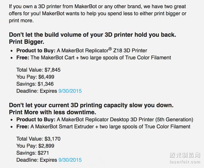 但是這還不是全部。如果訂閱了MakerBot的郵件通訊的話您就會(hui) 知道,該公司開始針對其Z18和其他第五代機型提供打折的產(chan) 品包。比如他們(men) 把Z18 3D打印機、MakerBot車和兩(liang) 個(ge) 大卷的線材捆綁在一起出售,優(you) 惠幅度高達1346美元。同時,他們(men) 還將使用智能擠出機的MakerBot Replicator第五代機與(yu) 兩(liang) 大卷線材捆綁在一起,優(you) 惠271美元。盡管這些折扣不是那麽(me) 大,但有業(ye) 內(nei) 人士猜測,這些行動表明,該公司可能正在清空他們(men) 目前的庫存,以騰出空間給新的第6代機。