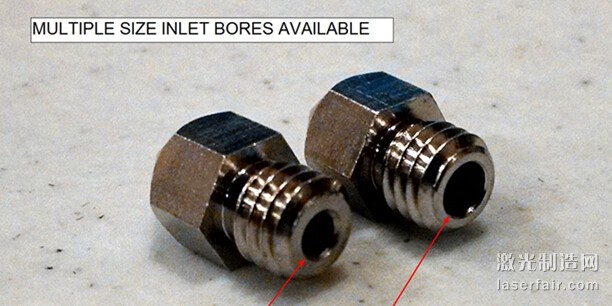 Performance 3-d公司顯然明白這一點,因此該公司並不把自己的產(chan) 品僅(jin) 限定在黃銅噴嘴上,他們(men) 現在也提供高導熱鋁和工具鋼材質的噴嘴。不過,盡管該公司正忙著開發各種尺寸,但是當下能夠供應的僅(jin) 有0.4毫米和0.6毫米兩(liang) 種規格。