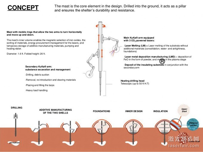設計團隊稱,水會(hui) 被存儲(chu) 在Sfero外部兩(liang) 層鐵至外殼之間,這樣能夠幫助屏蔽外部致命的太陽輻射。而用來打造Sfero的機器人將具有長長的柱狀外形,它將鑽入火星表麵幾米深以從(cong) 土壤中提取材料構建居所外殼。該機器人有兩(liang) 個(ge) 相互獨立的手臂,一個(ge) 用於(yu) 從(cong) 土壤中獲取鐵材料,另外一個(ge) 手臂上則安裝了金屬3D打印機,它能夠將生鐵轉化為(wei) 金屬粉末然後再用高功率激光一起熔化。打印機將首先使用鐵打造堅實的地基。然後再製造Sfero的兩(liang) 層外殼,每層外殼都將是球形,而且其內(nei) 部是蜂窩結構,這使它的強度足以抵抗Sfero內(nei) 部宜人的氣壓與(yu) 火星表麵氣壓的差距。