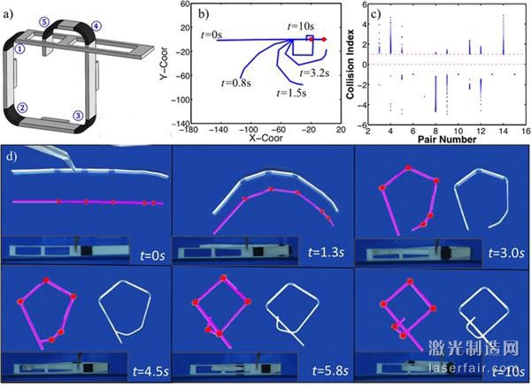 這個(ge) 測試對象是研究團隊用智能形狀記憶聚合物(SMPs)打印而成的,這種SMP材料經過了分子層麵的編程,一開始是一種形狀,但是一旦被施加一個(ge) 單一的熱源,即可自動變形為(wei) 第二種特定的形狀。在這個(ge) 實驗中,研究團隊將多個(ge) 材料一起3D打印,創造出一種複雜自組裝的可控序列。而且研究人員巧妙利用了不同SMP材料對於(yu) 溫水的反應差別,使得各個(ge) 部分的動作按順序進行,不至於(yu) 互相碰撞。