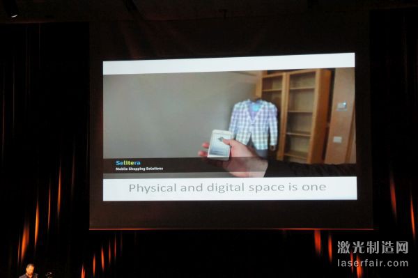 他舉(ju) 了一個(ge) 目前正在研發中且已經在應用的實例,用手機像是電腦工具一樣點選攝影畫麵中的不同服裝色塊,就可以透過特殊光源投射同樣的色塊到到展示的衣服上,這是一種把把虛擬與(yu) 真實在同一個(ge) 衣服展示間中呈現。