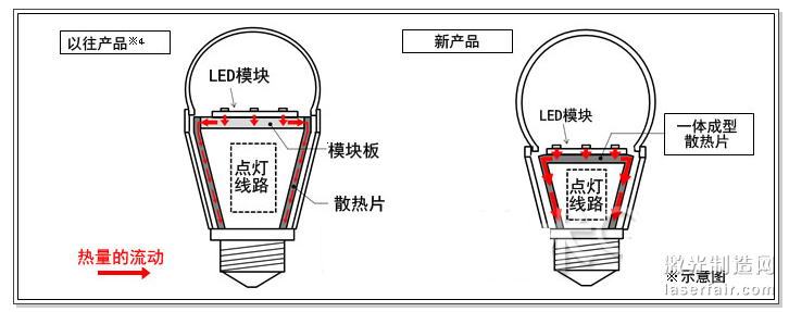 在以往產(chan) 品中,可安裝LED模塊的模塊板和散熱片是以不同的部分來構成的,因此存在熱輻射及熱傳(chuan) 導損失。而此次開發了“一體(ti) 成型散熱片”,將模塊片和散熱片一體(ti) 化,實現了沒有接縫的一個(ge) 散熱片。