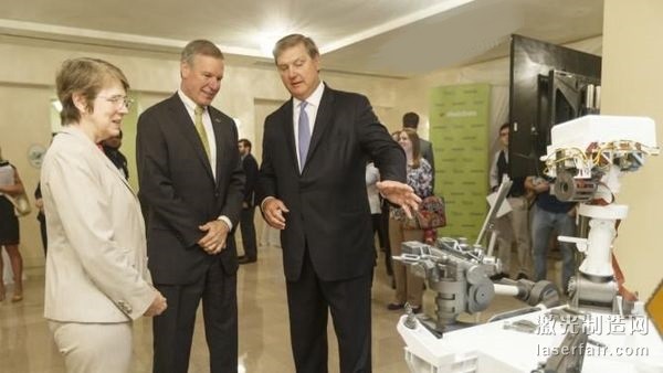 西門子美國公司總裁兼CEO Eric Spiegel(右)正在與(yu) 佐治亞(ya) 理工學院總裁George Peterson(中)和佐治亞(ya) 理工應用研究公司研究部總經理Jilda Garton交談