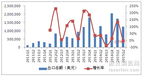 從(cong) 季度出口額的增長趨勢看,2012年Q1至2014年Q2出口額一直處於(yu) 高速增長,2013年Q3增長率達到最高213.8%。在2014年Q3開始,出口額增速開始變緩,雖然2015年Q1出口額增長率回彈,達到133%,但2015年Q2的出口額為(wei) 120萬(wan) 美元,出口增速僅(jin) 為(wei) -2.7%。
